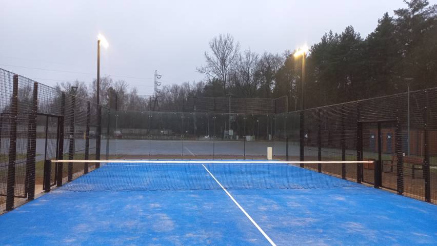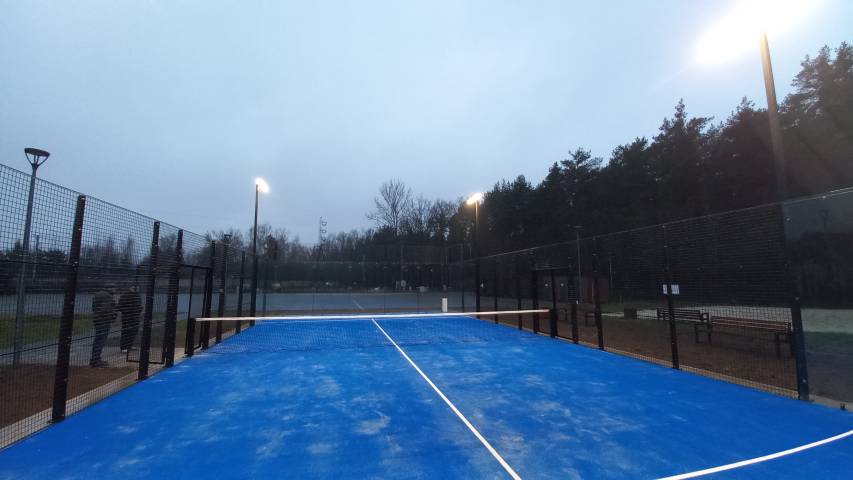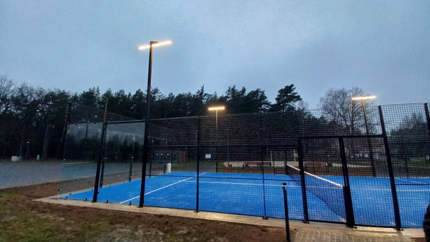 Oświetlenie kortu do padla: Słupy oświetleniowe umieszczone przy dłuższych bokach kortu, na zewnątrz ogrodzenia. Każdy słup wyposażony w nowoczesne lampy LED. Zamontowany będzie również włącznik czasowy światła (po upływie 30 minut będzie konieczność naciśnięcia przycisku celem przedłużenia świecenia światła o kolejne 30 minut – zabezpieczenie przed ciągłym świeceniem oświetlenie).